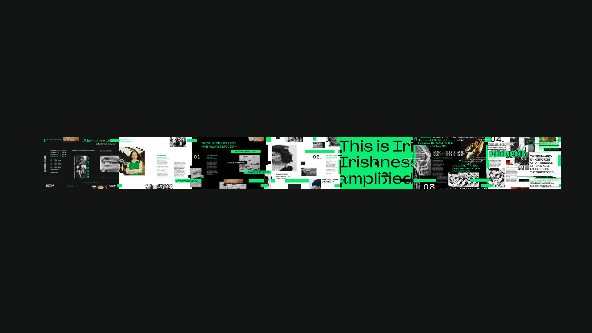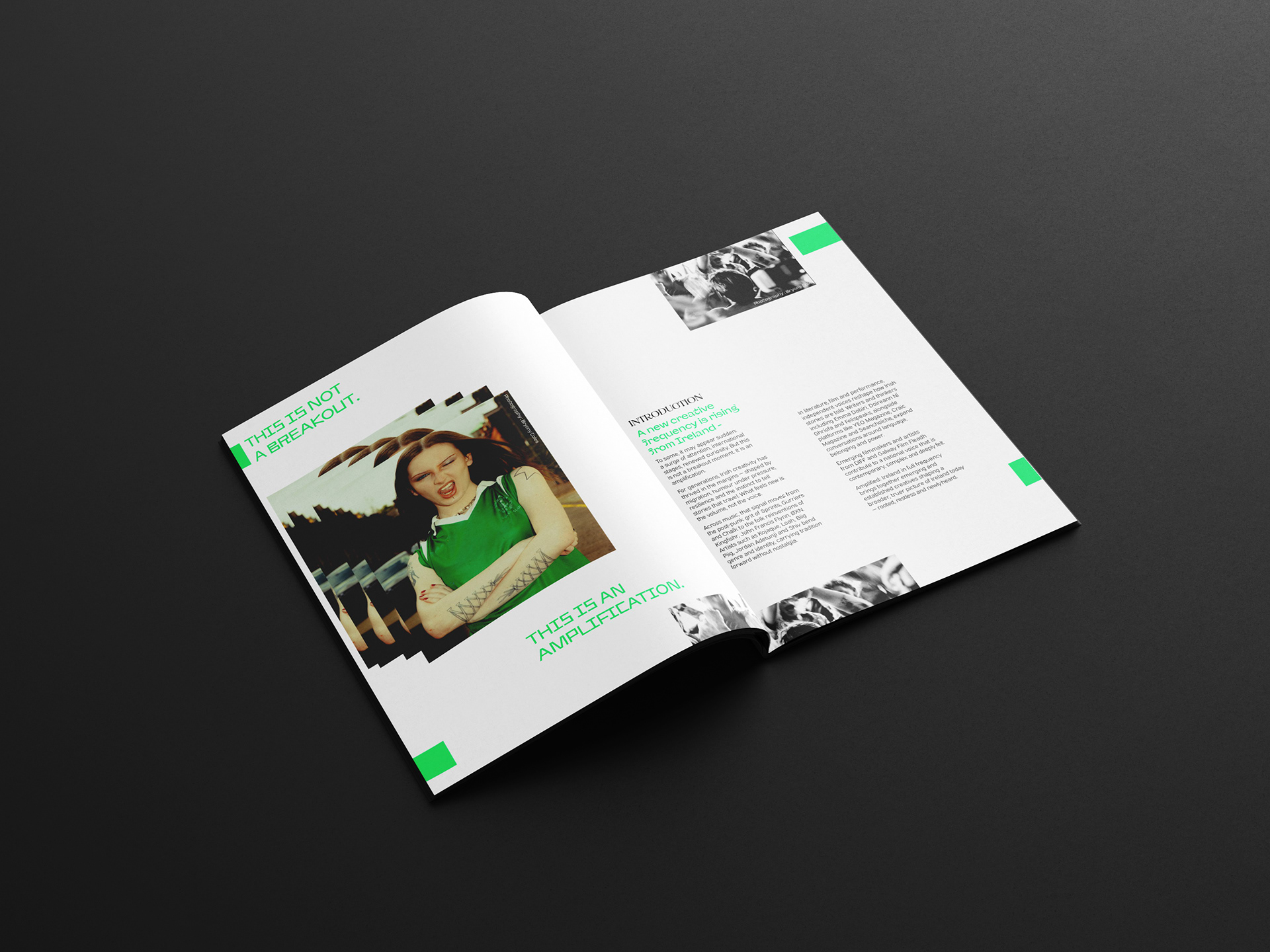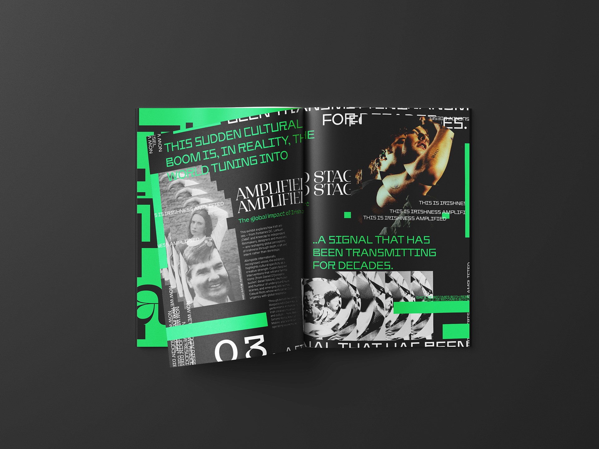 Amplified: Ireland in Full Frequency is a conceptual exhibition that explores Irish creativity as a living signal - rooted in storytelling, shaped by resilience and carried globally. Bringing together established and emerging voices across music, art and culture, the exhibition moves beyond trend or stereotype to frame Irish expression as an ongoing transmission. Photography by Bryony Coles and Enda Bowe sets the tone of the brochure editorial, reflecting the project’s rising energy and momentum.